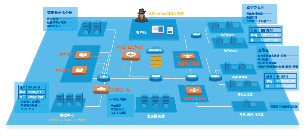 以数据安全态势感知为核心,使数据资产的分布、访问、面临的风险可视化、可管理,在规划、建设、运行过程中,同步考虑“将数据资产的分布、访问、面临的风险可视化、可管理”的数据安全策略,建立数据安全态势感知体系。